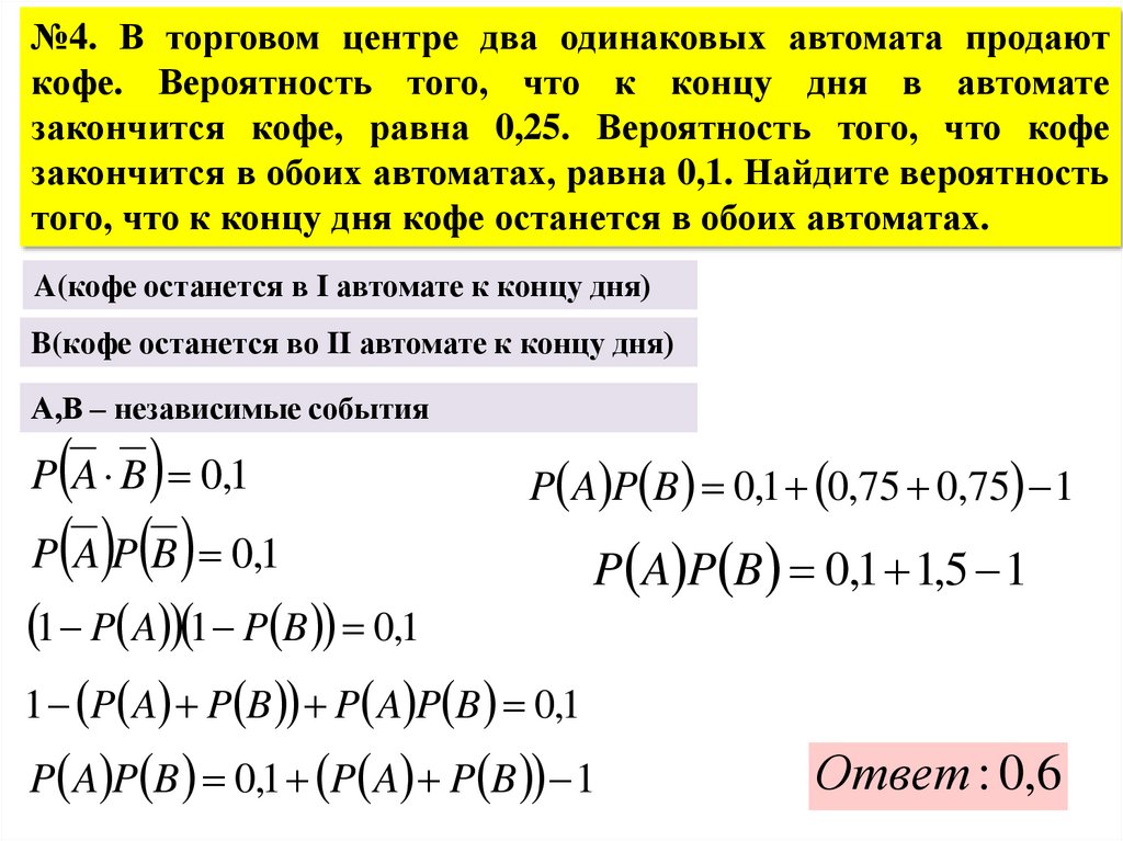 №4. В торговом центре два одинаковых автомата продаюткофе. Вероятность того, что к концу дня в автомате