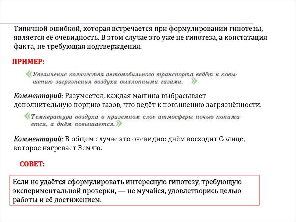 Типичной ошибкой, которая встречается при формулировании гипотезы,является её очевидность. В этом случае это уже не гипотеза, а констатация