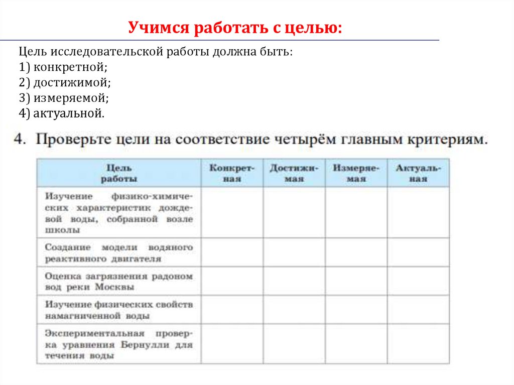 Учимся работать с целью:Цель исследовательской работы должна быть: