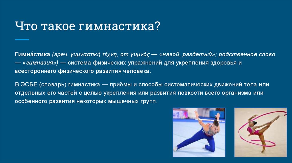 Что такое гимнастика?Гимнáстика (греч. γυμναστικὴ τέχνη, от γυμνός — «нагой, раздетый»; родственное слово