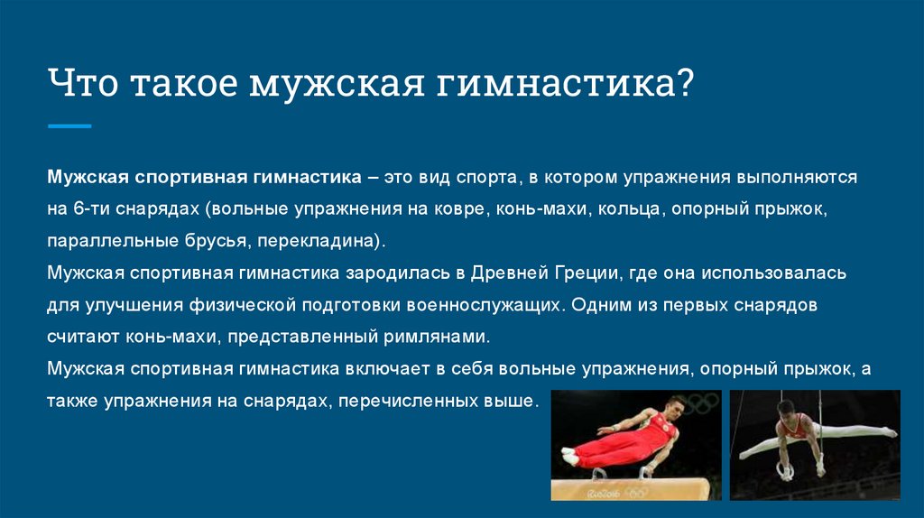 Что такое мужская гимнастика?Мужская спортивная гимнастика – это вид спорта, в котором упражнения выполняются