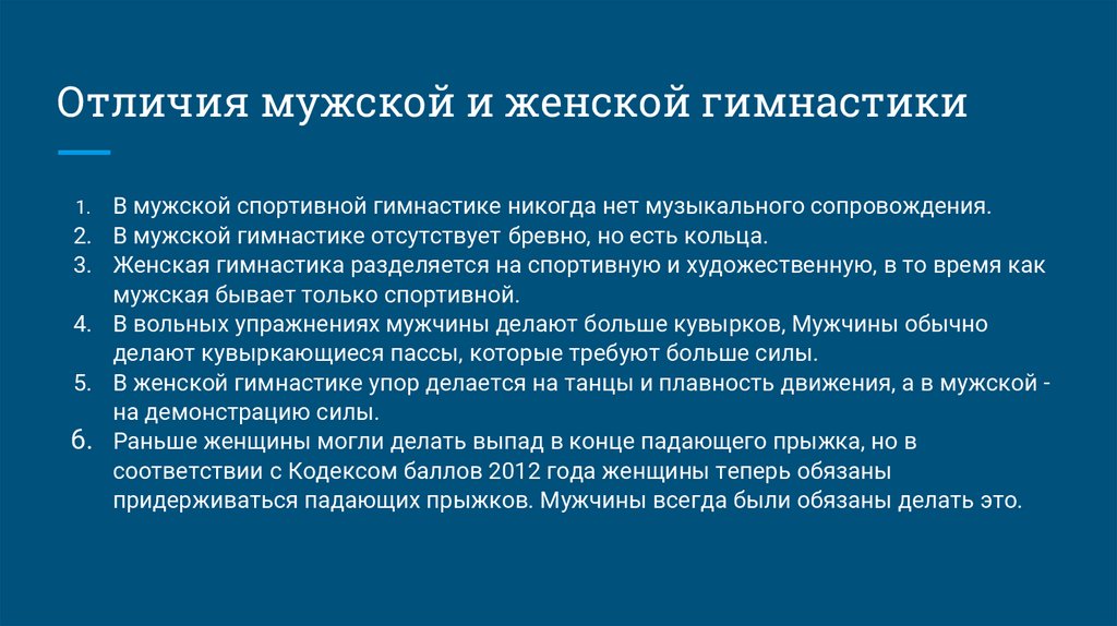 В женской гимнастике упор делается на танцы и плавность движения, а в мужской на демонстрацию силы.