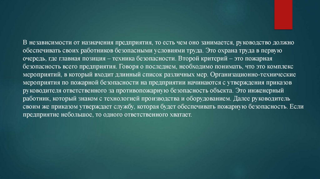 В независимости от назначения предприятия, то есть чем оно занимается, руководство должнообеспечивать своих работников безопасными условиями труда. Это охрана труда в первую
