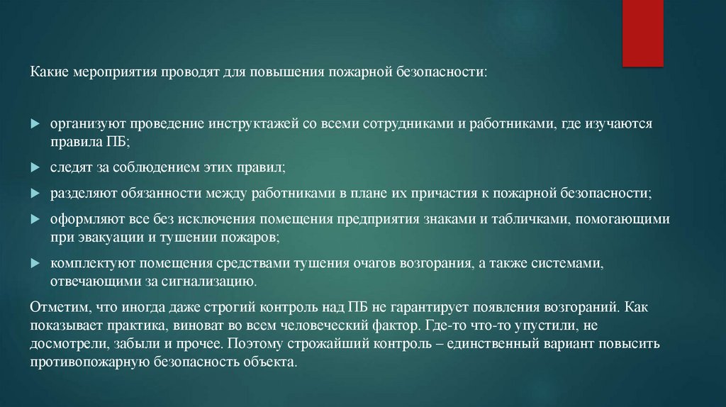 Какие мероприятия проводят для повышения пожарной безопасности:организуют проведение инструктажей со всеми сотрудниками и работниками, где изучаются