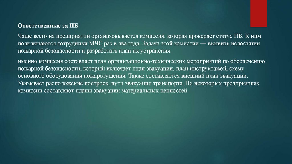 Ответственные за ПБЧаще всего на предприятии организовывается комиссия, которая проверяет статус ПБ. К ним