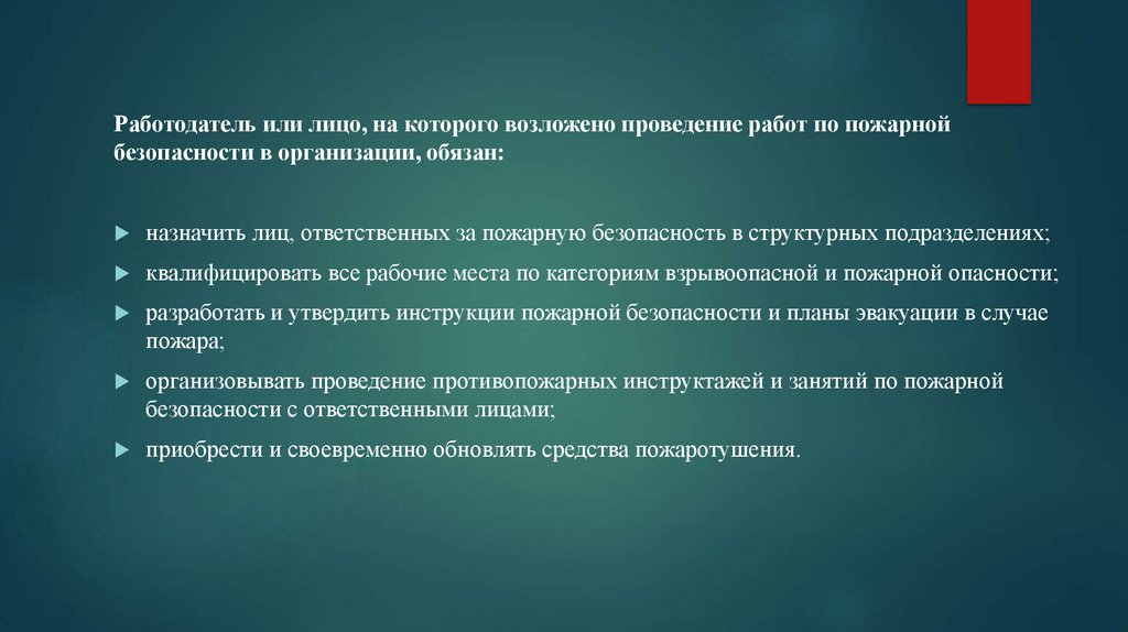 Работодатель или лицо, на которого возложено проведение работ по пожарнойбезопасности в организации, обязан: