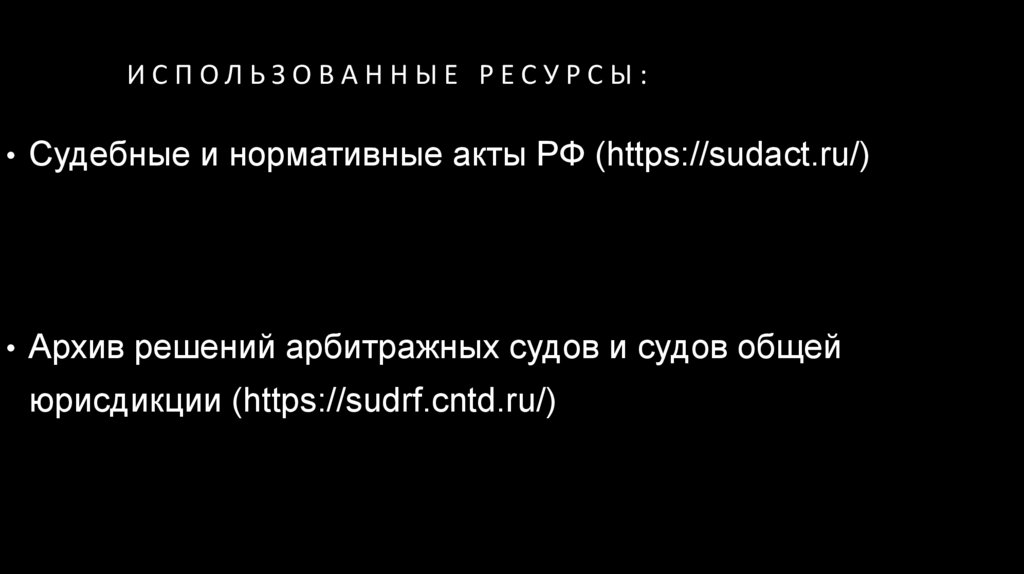 ИСПОЛЬЗОВАННЫЕ РЕСУРСЫ:• Судебные и нормативные акты РФ (https://sudact.ru/)