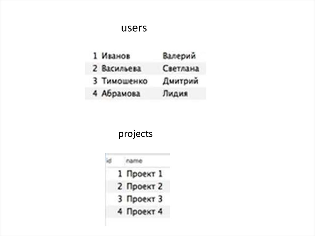 Получим всех пользователей и списокпроектов, в которых они участвуют: