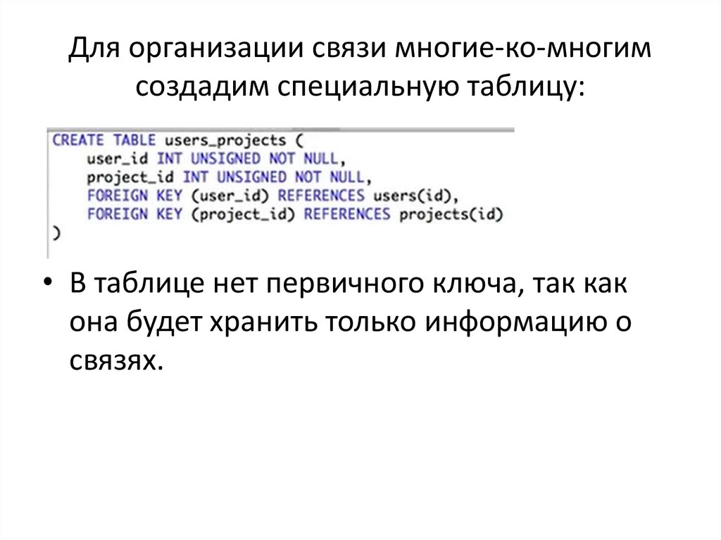 Для организации связи многие-ко-многимсоздадим специальную таблицу:
