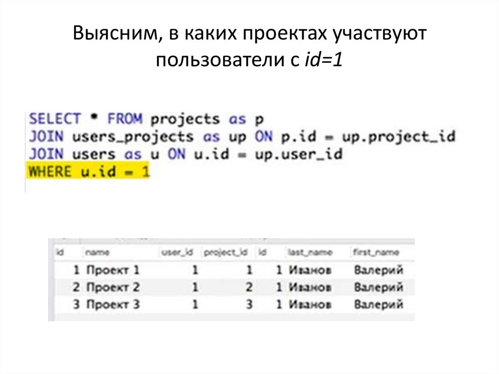 Выясним, в каких проектах участвуютпользователи с id=1