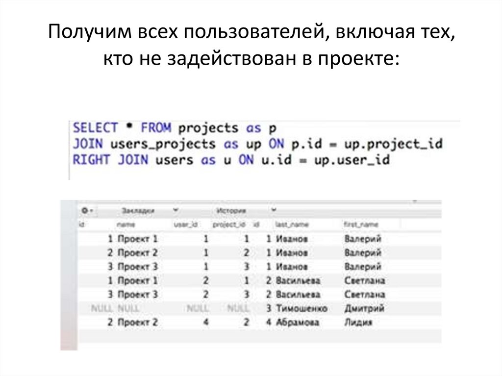 Получим всех пользователей, включая тех,кто не задействован в проекте: