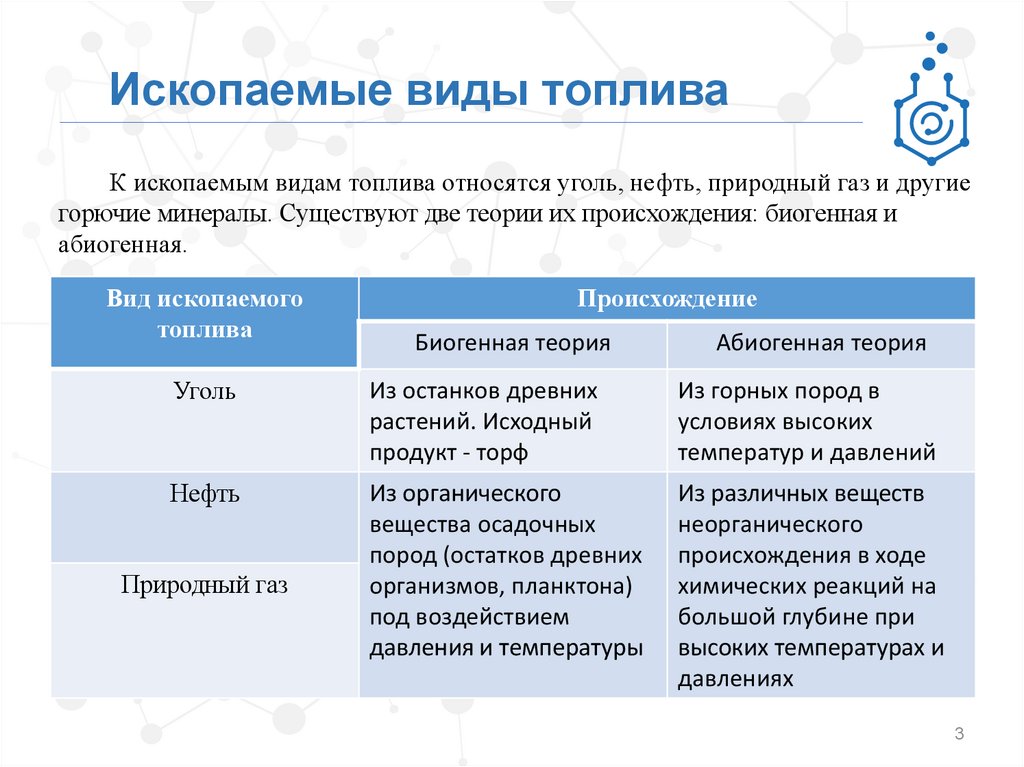 горючие минералы. Существуют две теории их происхождения: биогенная и