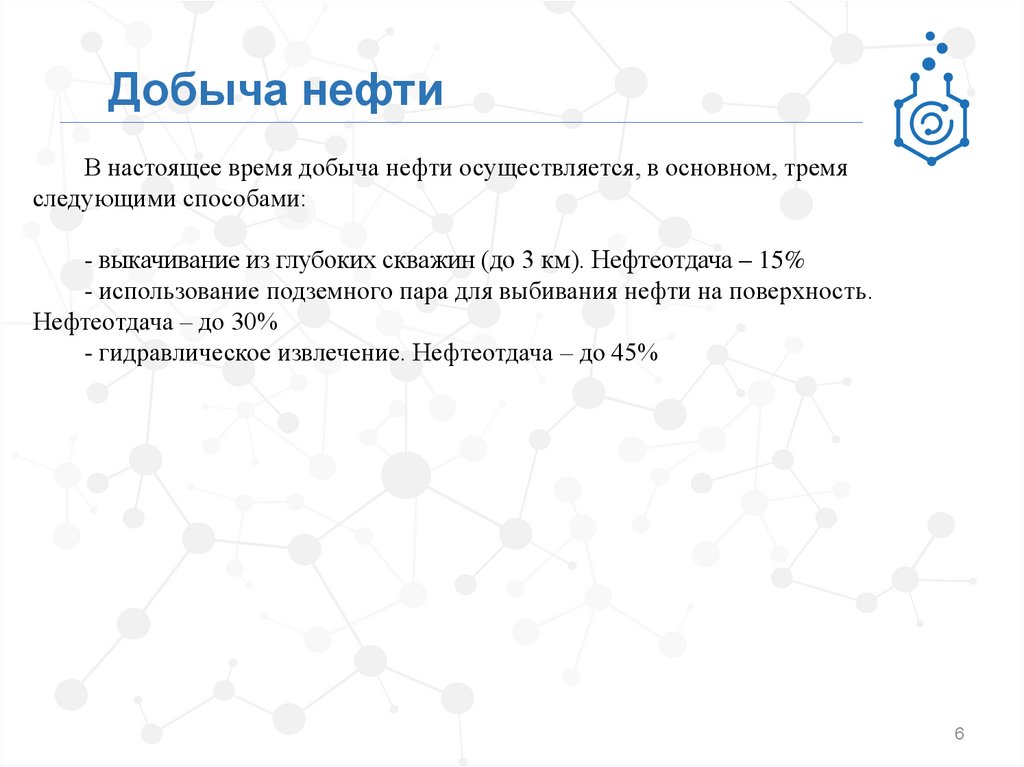 - выкачивание из глубоких скважин (до 3 км). Нефтеотдача – 15%