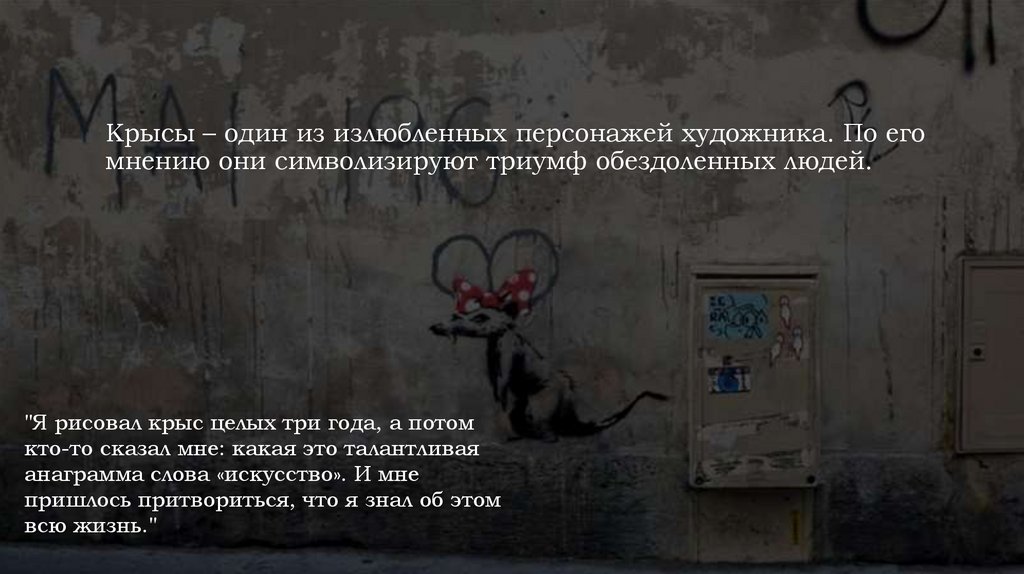 Крысы – один из излюбленных персонажей художника. По егомнению они символизируют триумф обездоленных людей.