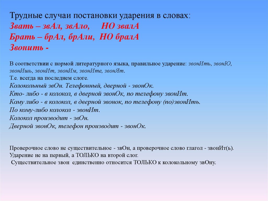 Трудные случаи постановки ударения в словах:Звать – звАл, звАло, НО звалА