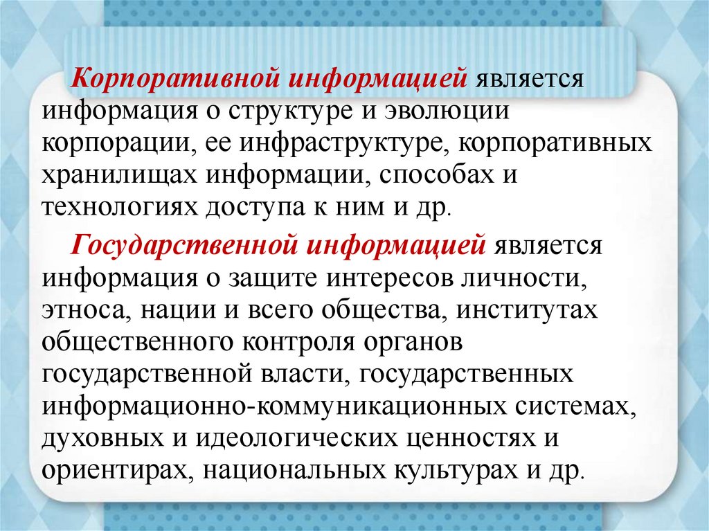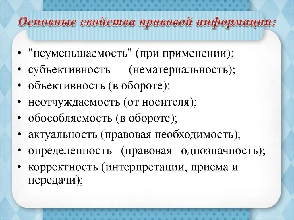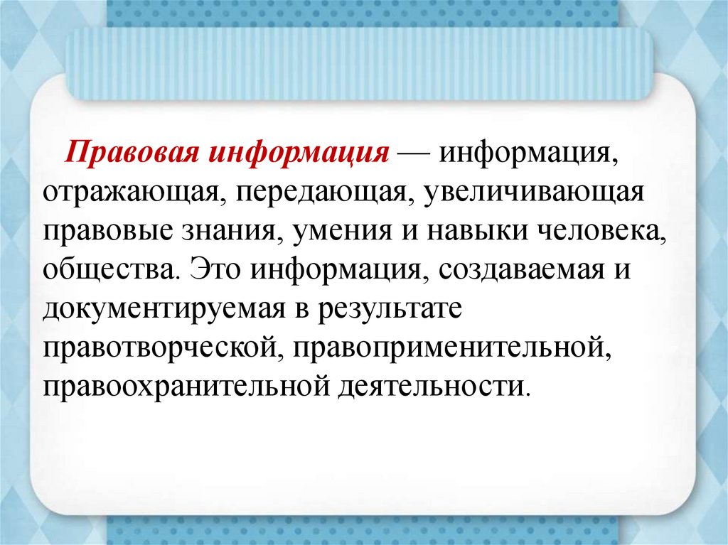 Правовая информация — информация,отражающая, передающая, увеличивающая