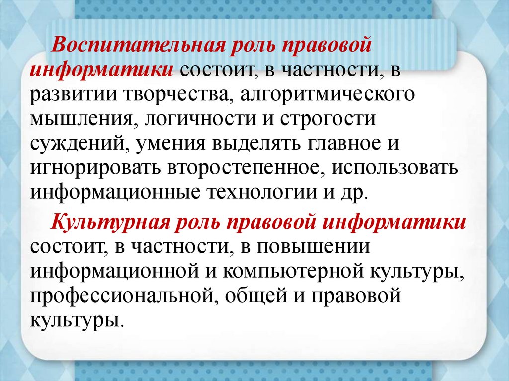 Воспитательная роль правовойинформатики состоит, в частности, в