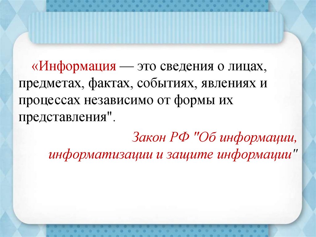 «Информация — это сведения о лицах,предметах, фактах, событиях, явлениях и