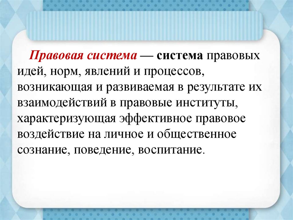 Правовая система — система правовыхидей, норм, явлений и процессов,