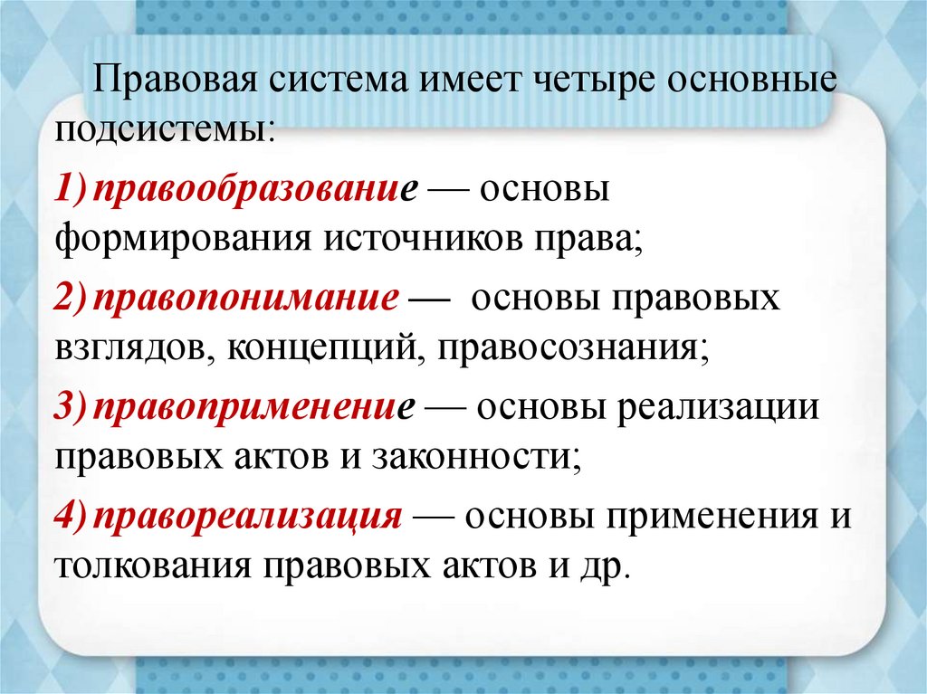 Правовая система имеет четыре основныеподсистемы: