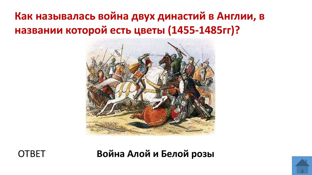 Как называлась война двух династий в Англии, вназвании которой есть цветы (1455-1485гг)?