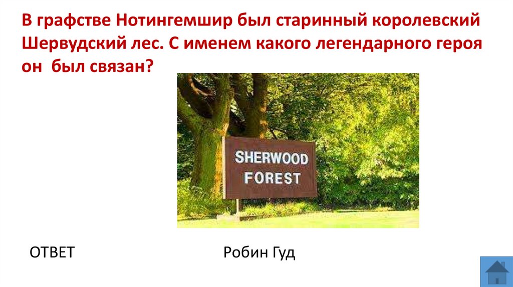 В графстве Нотингемшир был старинный королевскийШервудский лес. С именем какого легендарного героя