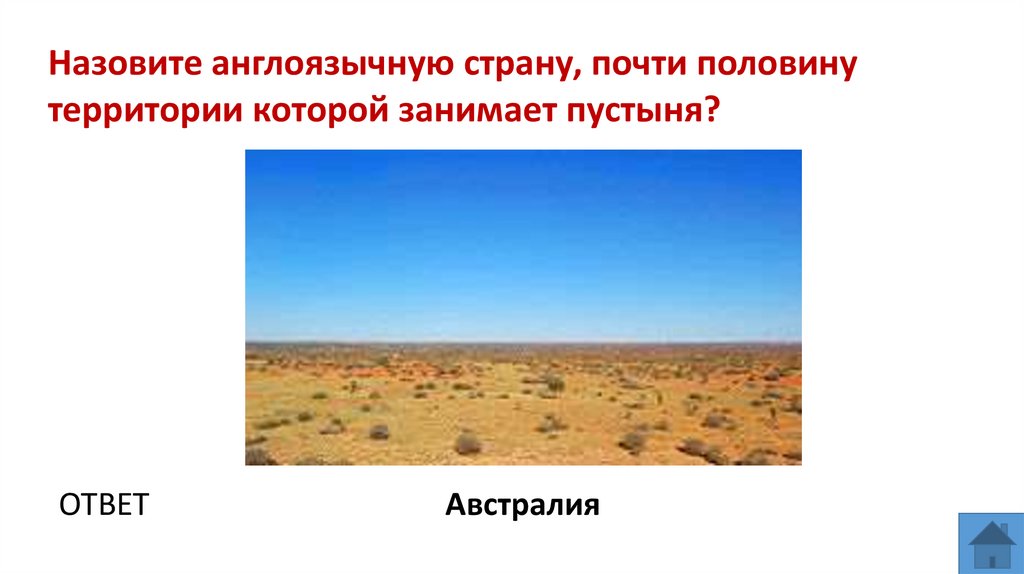 Назовите англоязычную страну, почти половинутерритории которой занимает пустыня?