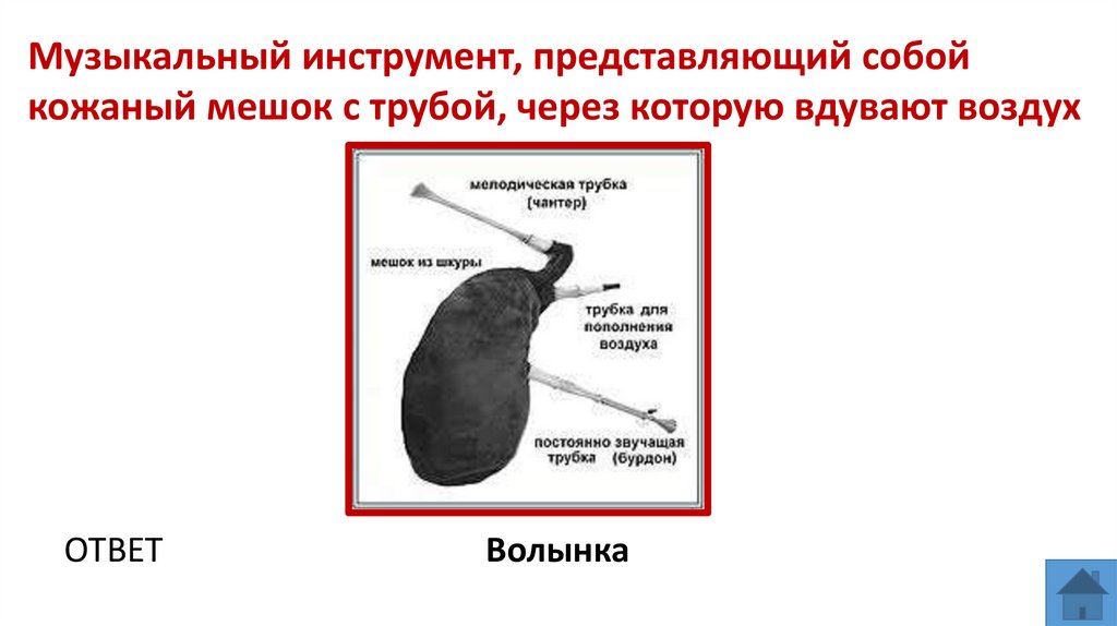 Музыкальный инструмент, представляющий собойкожаный мешок с трубой, через которую вдувают воздух