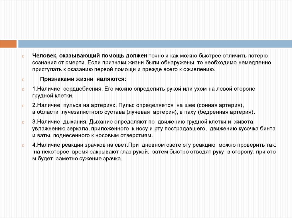 сознания от смерти. Если признаки жизни были обнаружены, то необходимо немедленно