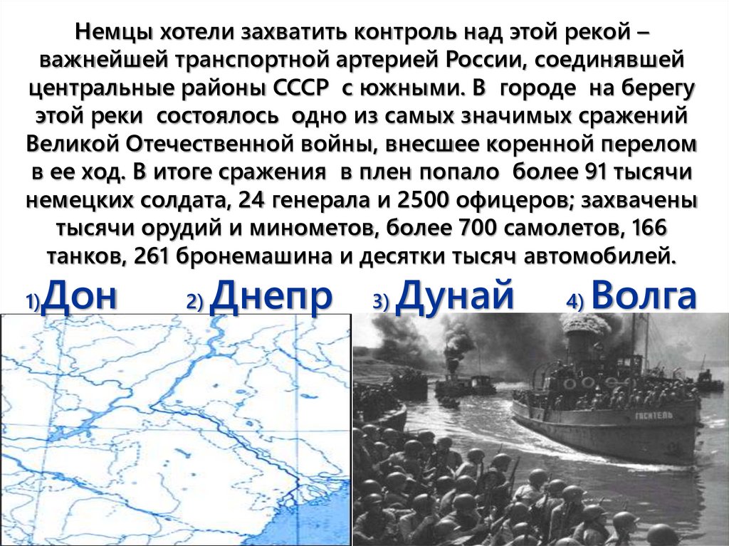 Немцы хотели захватить контроль над этой рекой –важнейшей транспортной артерией России, соединявшей
