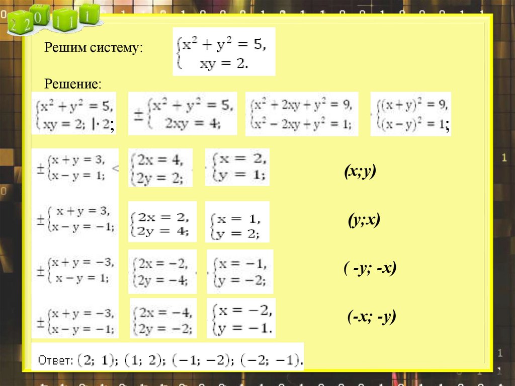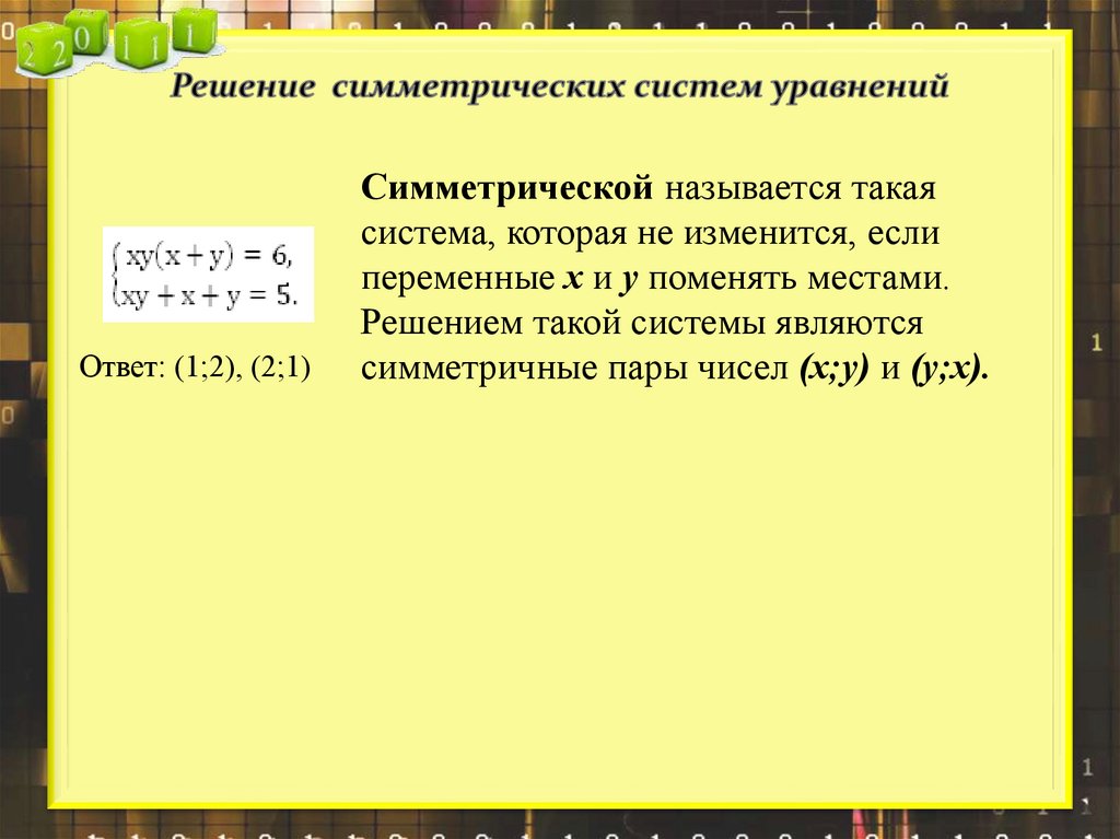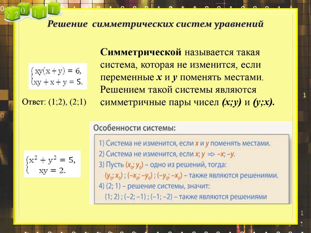 Ответ: (1;2), (2;1)Симметрической называется такая
