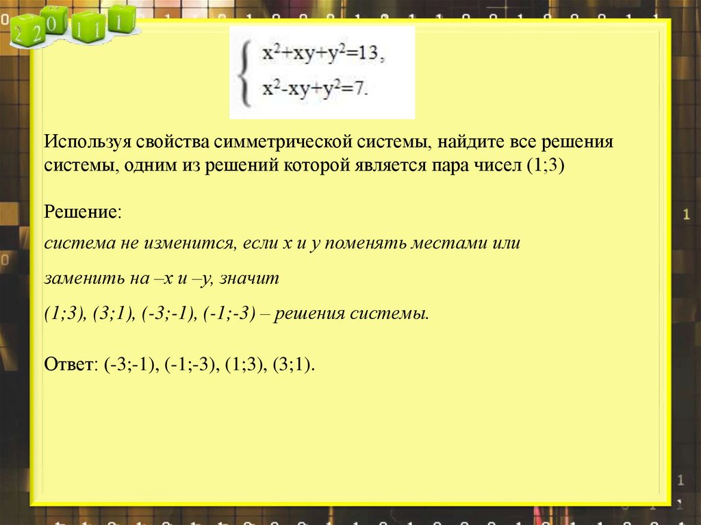 Используя свойства симметрической системы, найдите все решениясистемы, одним из решений которой является пара чисел (1;3)