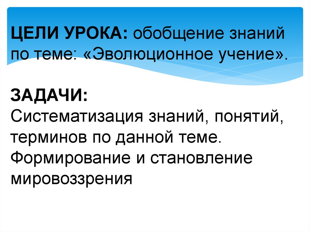 ЦЕЛИ УРОКА: обобщение знанийпо теме: «Эволюционное учение».