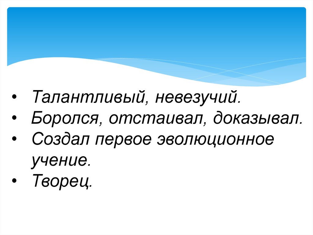 • Талантливый, невезучий.• Боролся, отстаивал, доказывал.