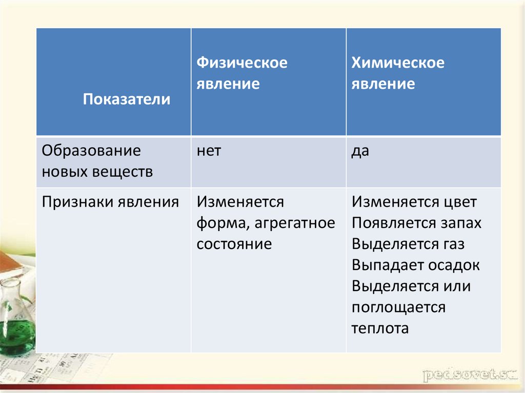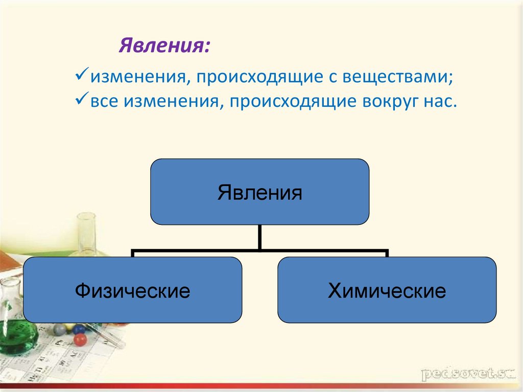 Явления:изменения, происходящие с веществами;