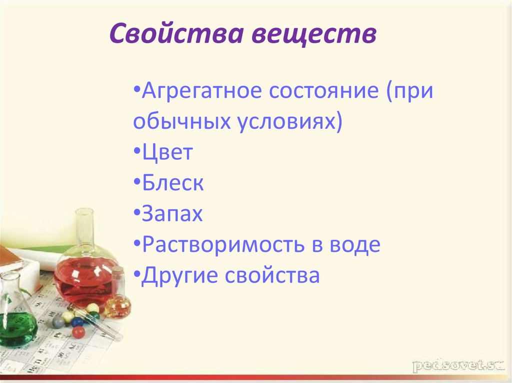 Свойства веществ•Агрегатное состояние (при