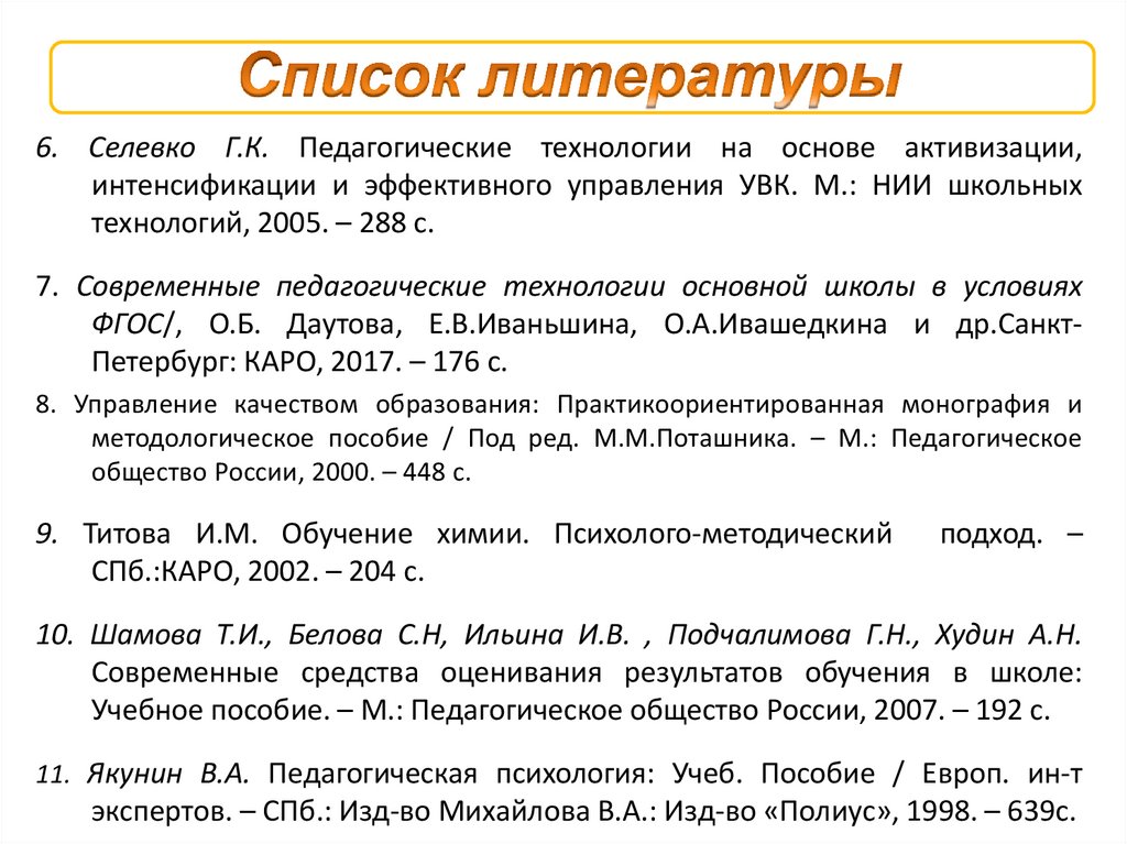 6. Селевко Г.К. Педагогические технологии на основе активизации,интенсификации и эффективного управления УВК. М.: НИИ школьных