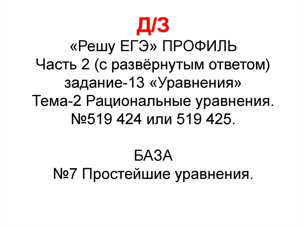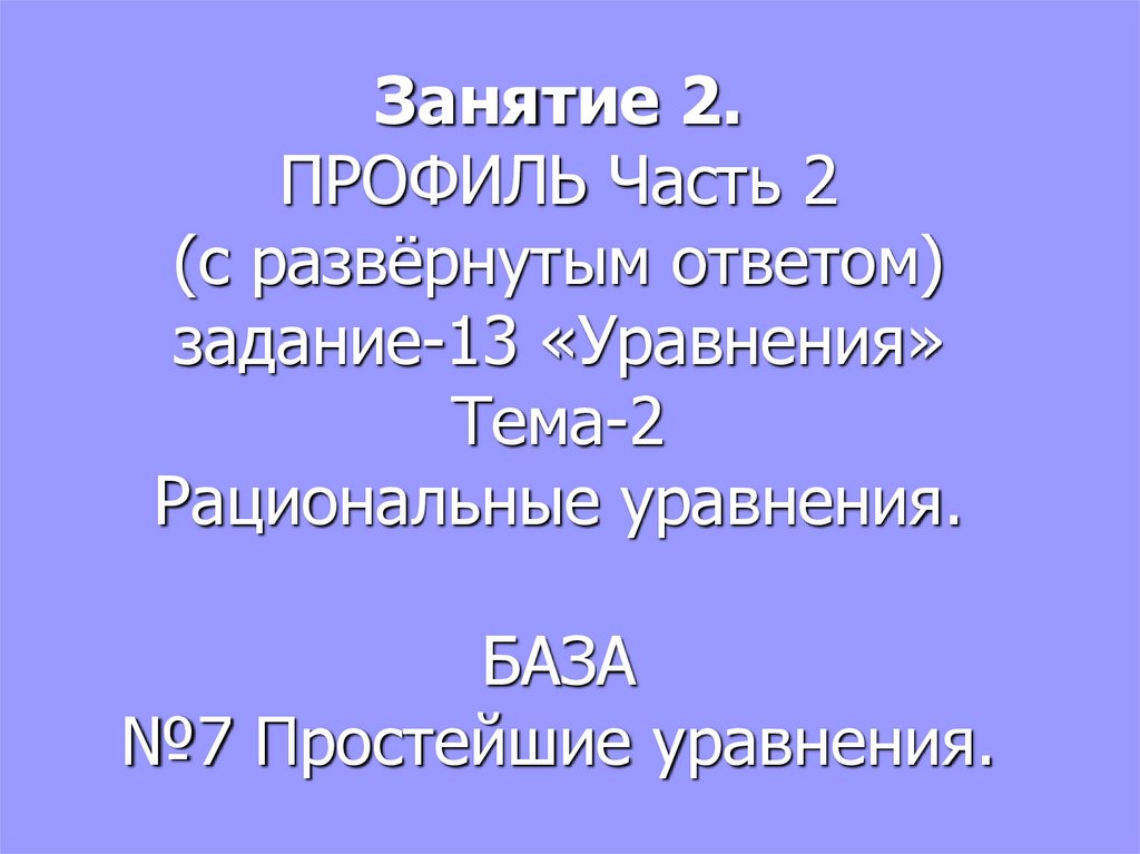 1. Занятие 2. ПРОФИЛЬ Часть 2 (с развёрнутым ответом) задание-13 «Уравнения» Тема-2 Рациональные уравнения. БАЗА №7 Простейшие