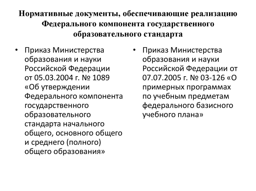 Нормативные документы, обеспечивающие реализациюФедерального компонента государственного