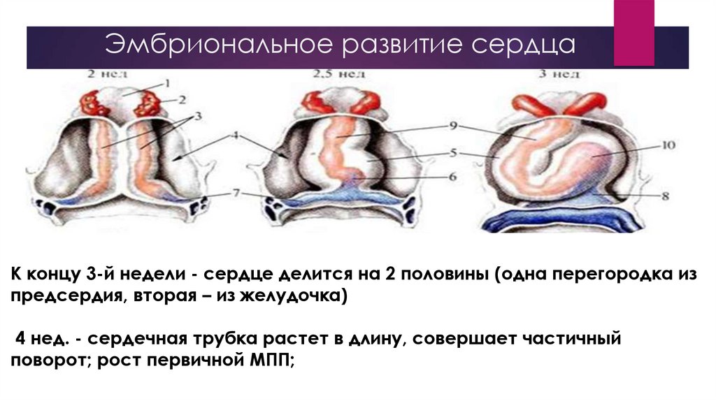 Эмбриональное развитие сердцаК концу 3-й недели - сердце делится на 2 половины (одна перегородка из