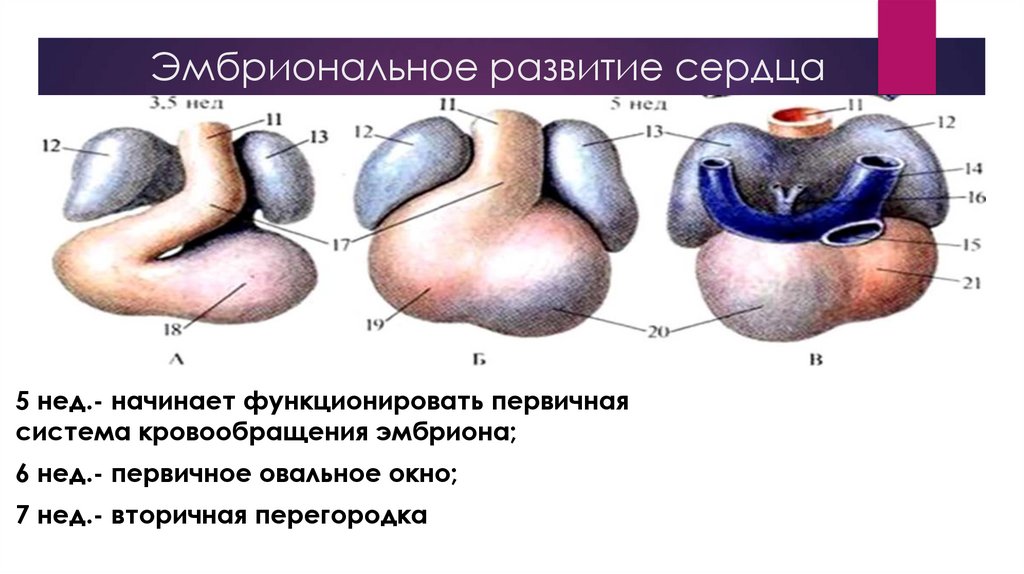 Эмбриональное развитие сердца5 нед.- начинает функционировать первичная