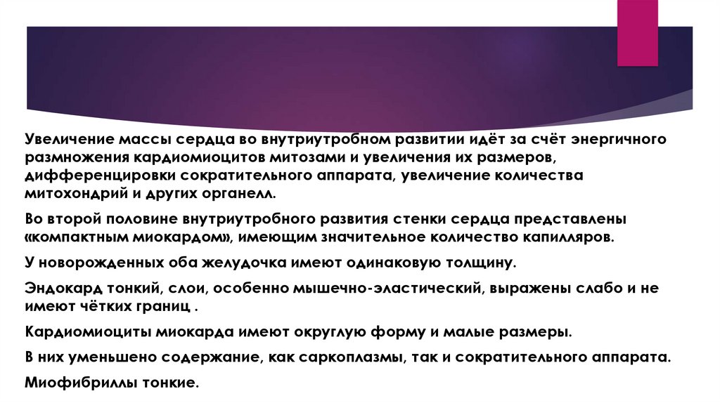 Увеличение массы сердца во внутриутробном развитии идёт за счёт энергичногоразмножения кардиомиоцитов митозами и увеличения их размеров,