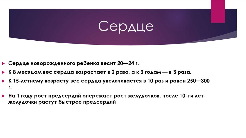 К 8 месяцам вес сердца возрастает в 2 раза, а к 3 годам — в 3 раза.