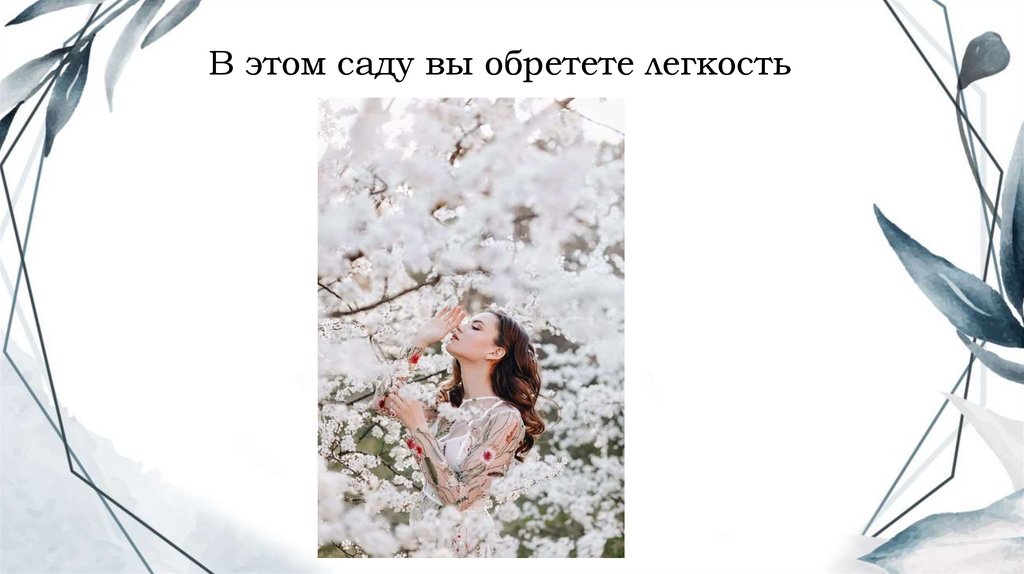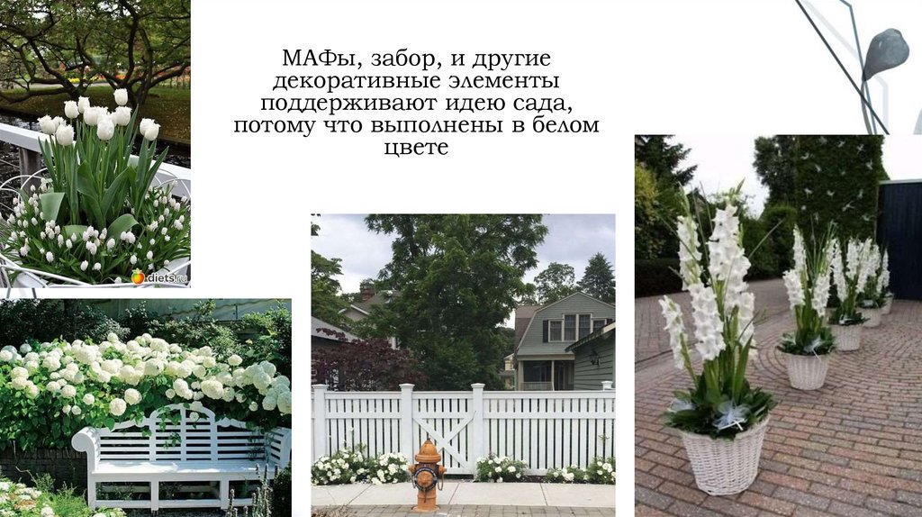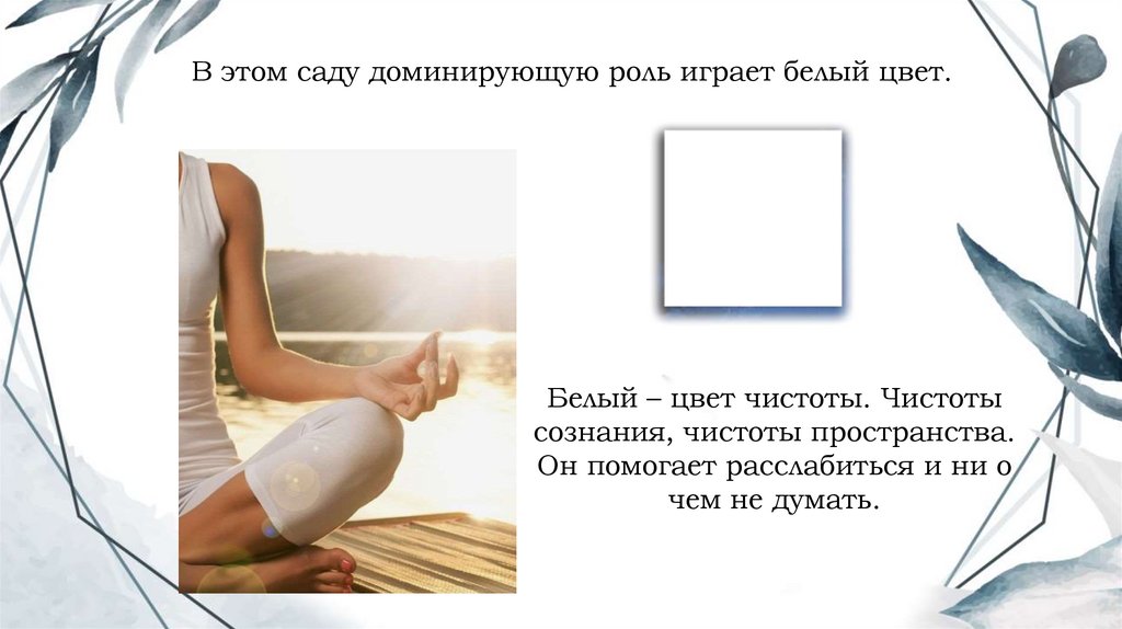 В этом саду доминирующую роль играет белый цвет.Белый – цвет чистоты. Чистоты