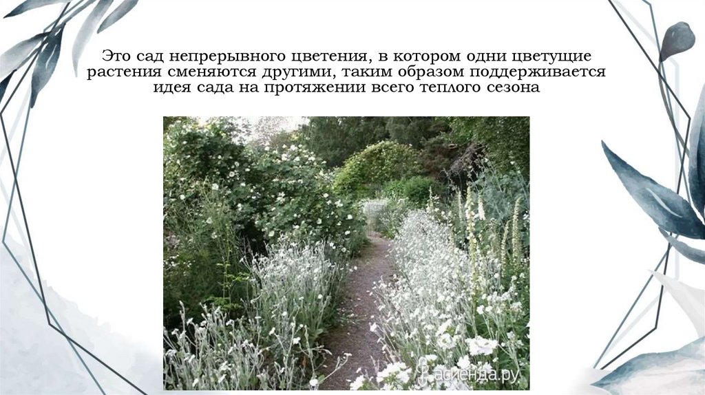 Это сад непрерывного цветения, в котором одни цветущиерастения сменяются другими, таким образом поддерживается