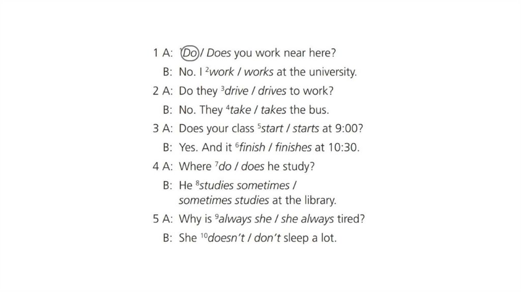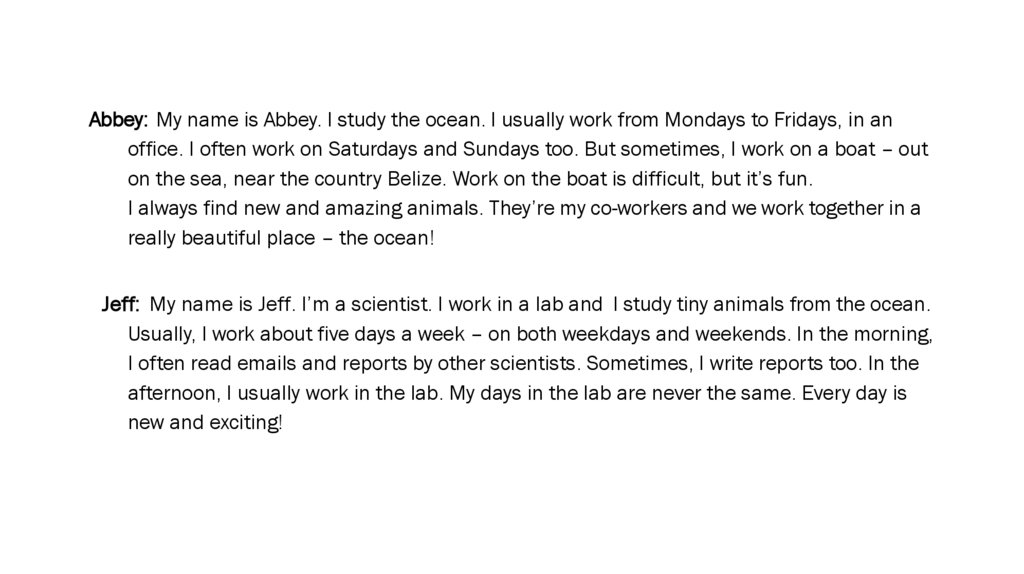 Abbey: My name is Abbey. I study the ocean. I usually work from Mondays to Fridays, in anoffice. I often work on Saturdays and Sundays too. But sometimes, I work on a boat – out
