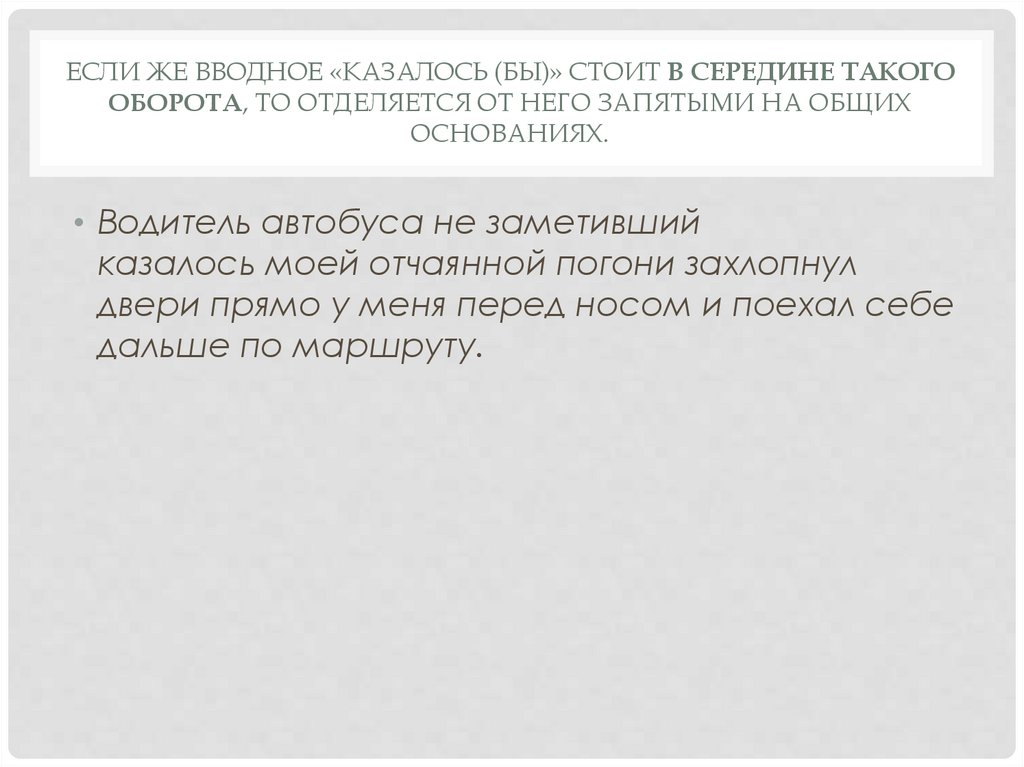 ЕСЛИ ЖЕ ВВОДНОЕ «КАЗАЛОСЬ (БЫ)» СТОИТ В СЕРЕДИНЕ ТАКОГООБОРОТА, ТО ОТДЕЛЯЕТСЯ ОТ НЕГО ЗАПЯТЫМИ НА ОБЩИХ