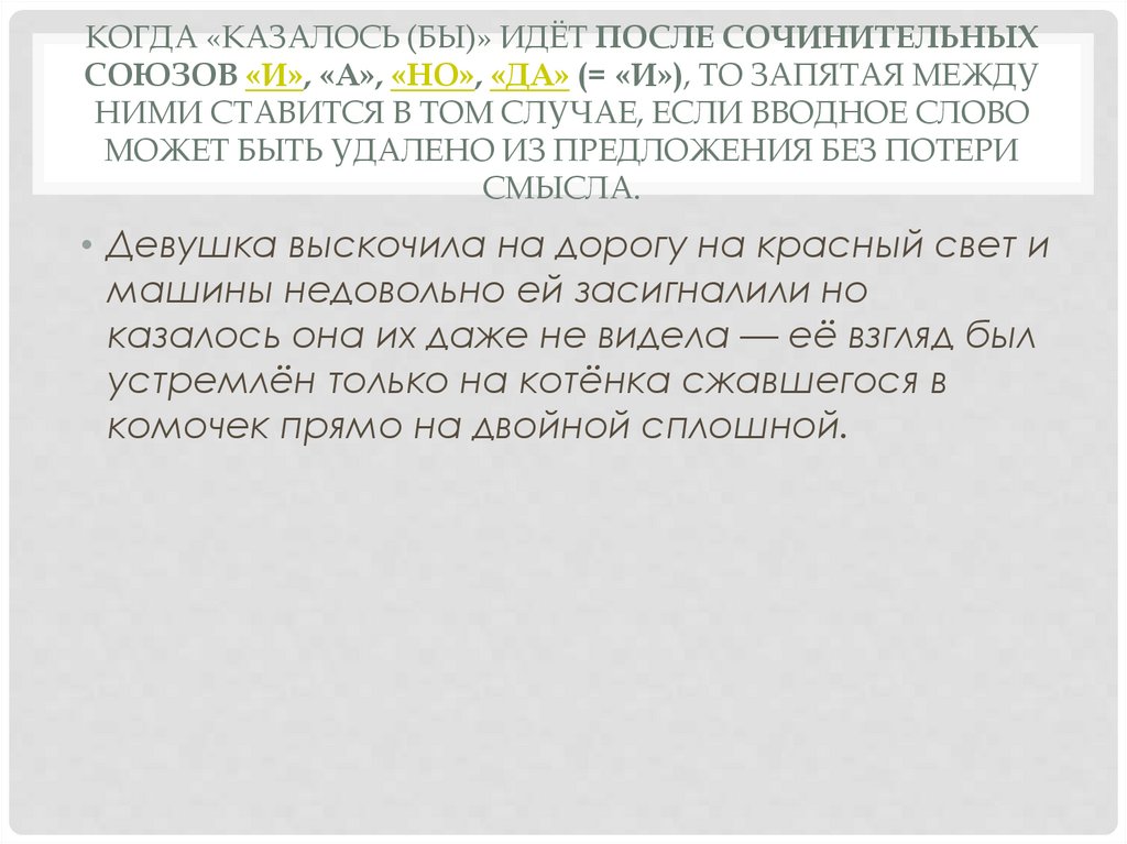 КОГДА «КАЗАЛОСЬ (БЫ)» ИДЁТ ПОСЛЕ СОЧИНИТЕЛЬНЫХСОЮЗОВ «И», «А», «НО», «ДА» (= «И»), ТО ЗАПЯТАЯ МЕЖДУ