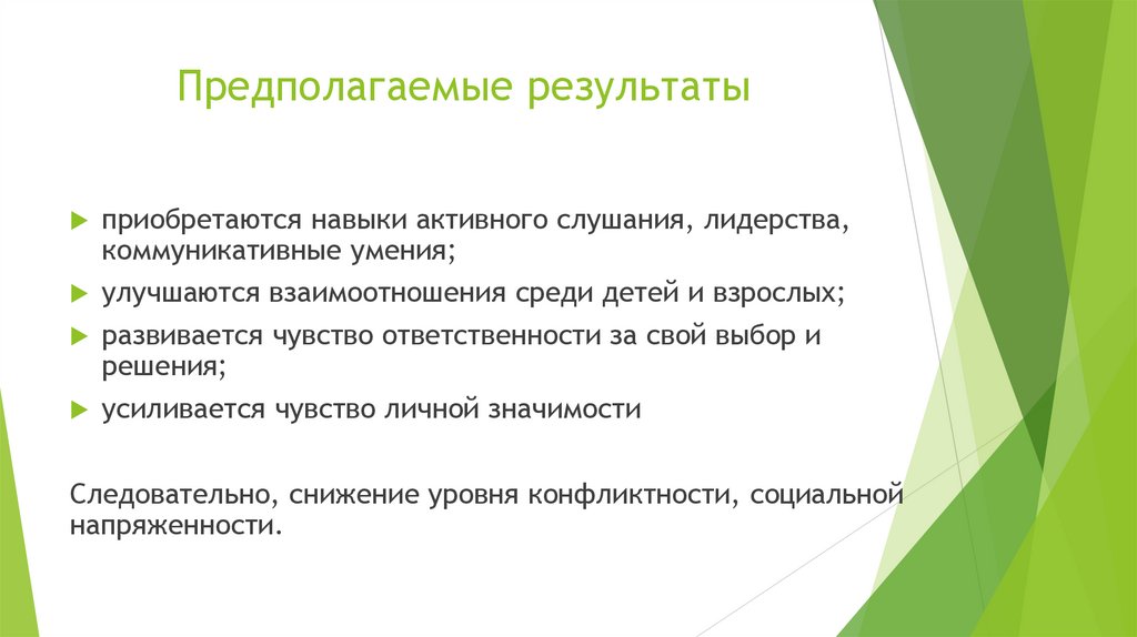 Предполагаемые результатыприобретаются навыки активного слушания, лидерства,