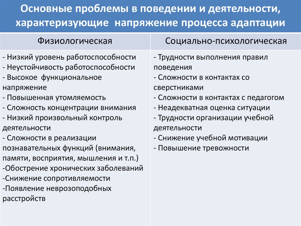 Основные проблемы в поведении и деятельности,характеризующие напряжение процесса адаптации